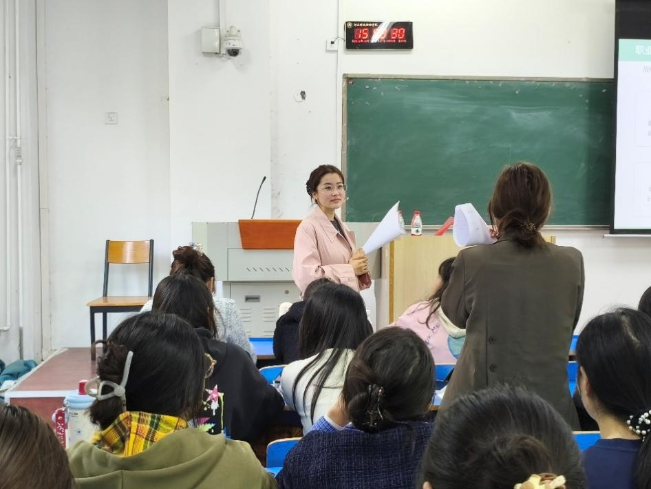 为助力学生明确职业发展方向和目标、加强专业认识、合理规划大学生活,10月14日,教育科学学院在龙子湖校区启智楼108教室成功举办“浅谈学前教育专业成长与幼儿园教师职业飞跃”的专题讲座。讲座特邀郑州市郑东新区龙子湖幼儿园支部书记、园长焦可心、保教处干事陈柏雯和教研组长孙俪嫚主讲,由董文浩老师主持,2025级学前教育专升本学生参加本次讲座。