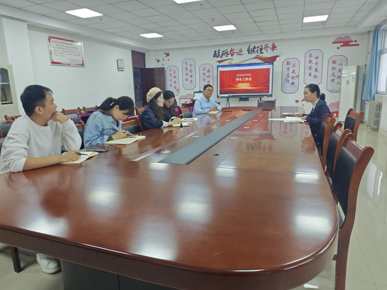 9月23日下午,教育科学学院召开学生工作例会。教育科学学院党总支副书记蔡颖,辅导员杨晶晶、胡怡铭、刘书越、董文浩、刘德磊参加了会议。会上,对近期的学籍管理、日常工作、资助工作、辅导员工作和学生宿舍管理等工作进行逐项安排布置,并对各项工作的重点和难点进行了讨论。目前正在开展的资助工作要公平公正公开,确保每一位需要帮助的学生都能得到及时有效的资助;辅导员要深入学生群体,加强与学生的沟通交流,做好学生的思想引领和心理疏导工作。同时,会议还就如何进一步提升学生工作效能、促进学生全面发展等方面进行了交流与探讨。