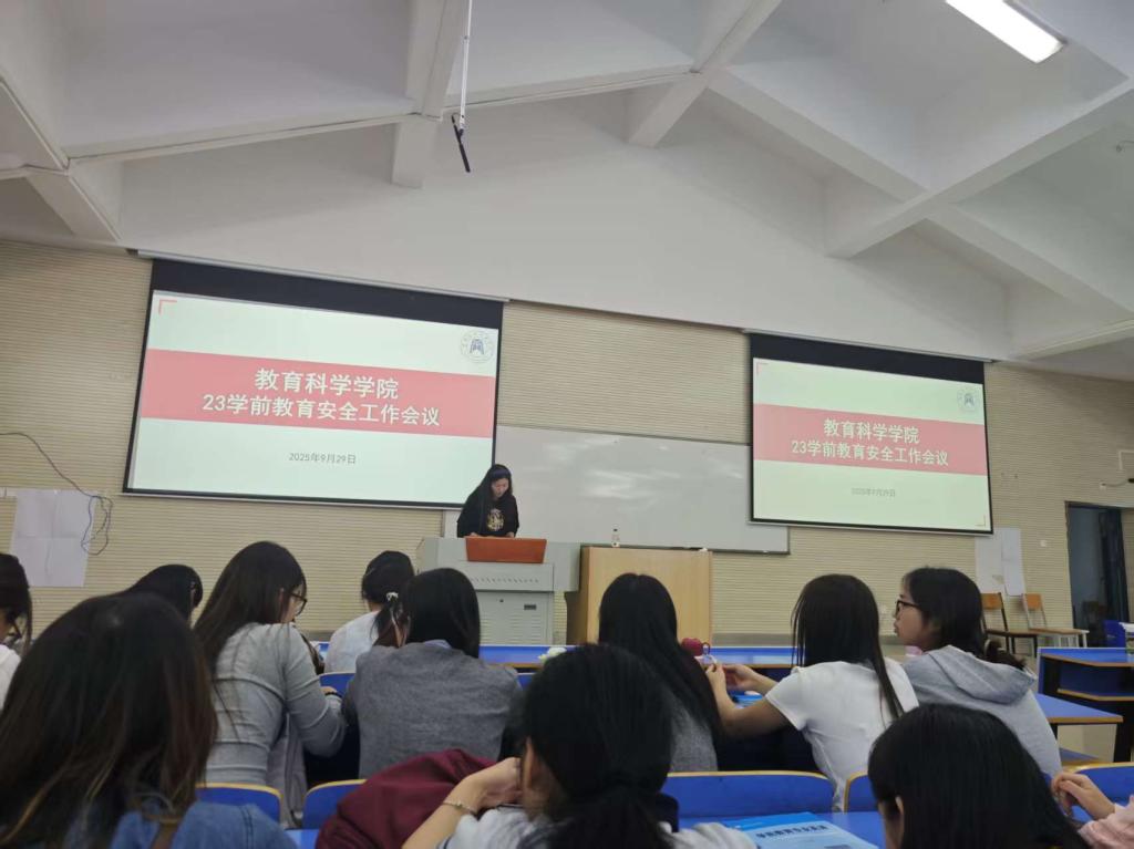 为强化学生安全意识,筑牢安全防线,9月29日,教育科学学院召开2023学前教育安全教育会议。辅导员胡怡铭主持,2023级学前教育专业全体学生参会。